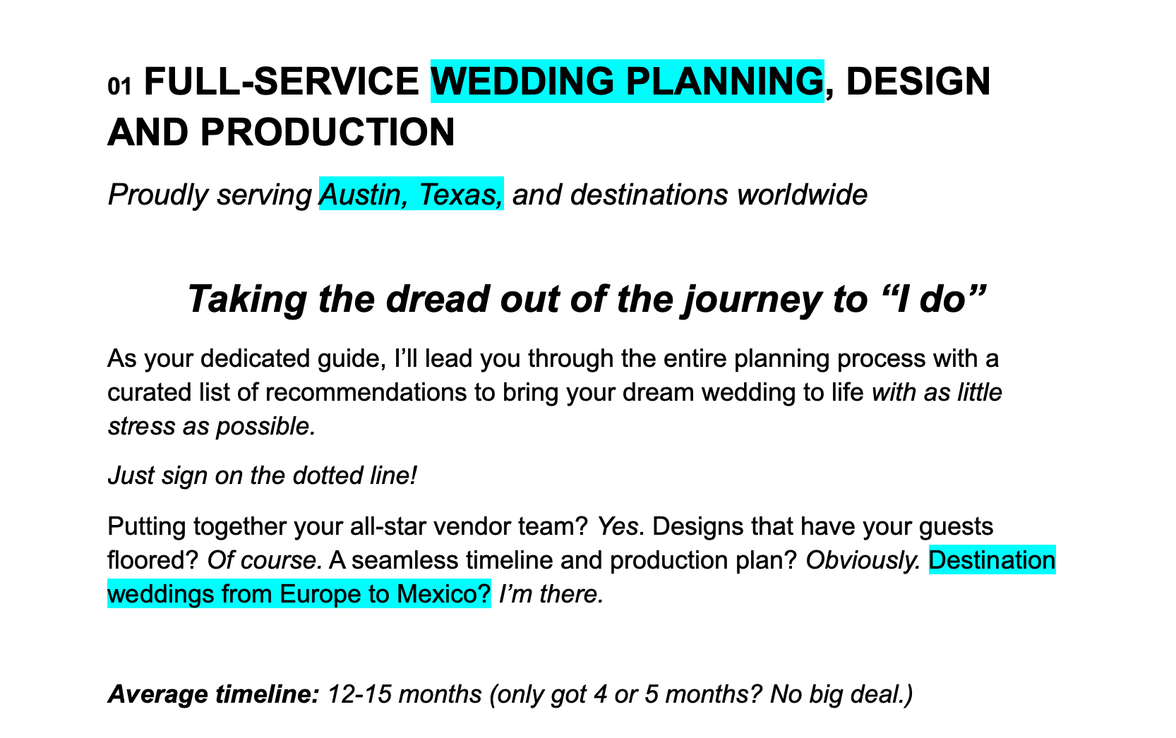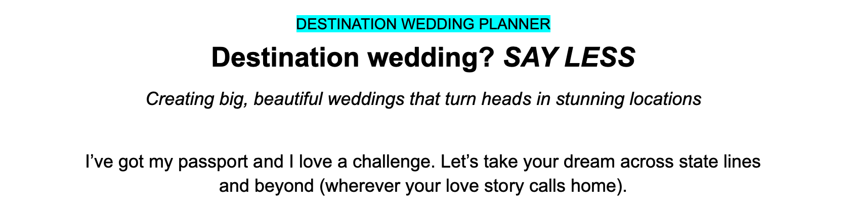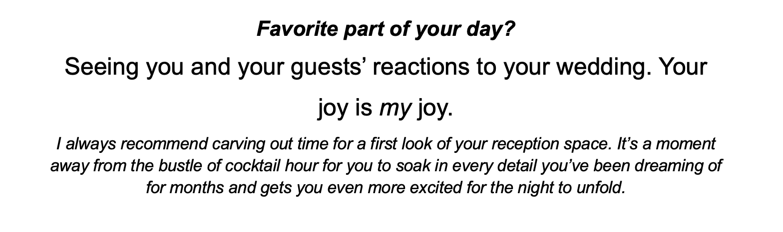 The problem: Valerie is a wedding planner and designer who creates the most BEAUTIFUL, thoughtful weddings for couples looking for completely unique experiences... but her website copy was outdated, confusing and didn't really truly reflect her voice and services.
